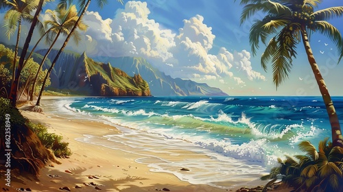 tropical, paradise, hawaiian, beach, palm tree, ocean, sunset, view, image, vacation, travel, exotic, summer, nature, landscape, scenery, horizon, relaxation, tour tourism, sunshine, coastline, seascape, romantic, idylli, holiday, tranquil, blue skies, colourful, vibrant, beauty, destination, tropical island, serene, leisure, enjoyment, sandy shore, beautiful sunset