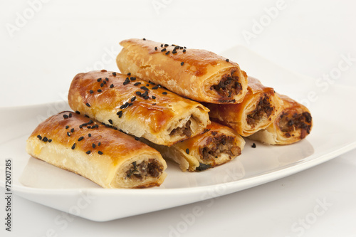 Turkish style meat stuffed filo dough rolls served