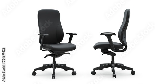 Two black office chairs sit sidebyside one facing forward the other in profile against a white background