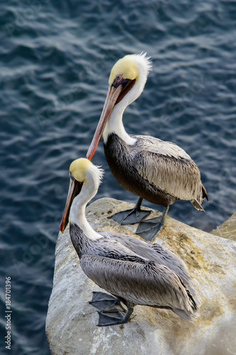 Two California brown pelicans cliffside