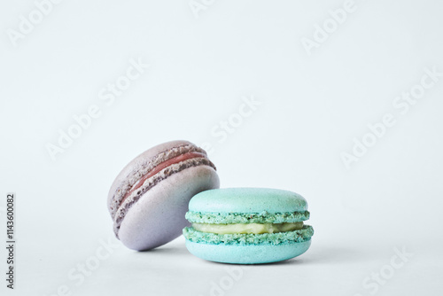 Two colorful French Macarons, cakes with different flavors, mint, apple, currant flavor. dessert, macaroons aquamarine, green, purple color. Copy space for text