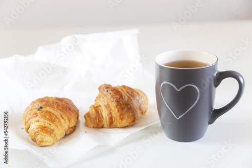 Two croissants with chocolate chips on a white sheet of paper on the table, a gray cup with a white heart with tea. Place for text