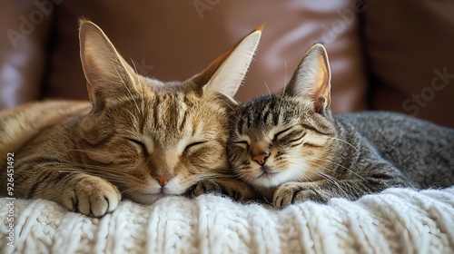 Two cute cats peacefully sleeping together on a cozy blanket, radiating warmth and comfort in a serene indoor setting.
