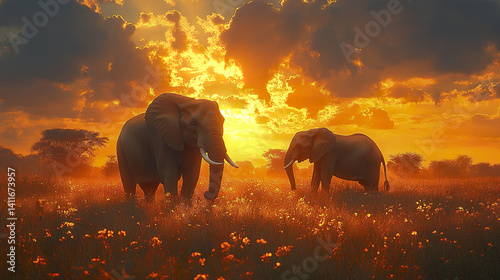 Two elephants roam vibrant savannah at sunset, surrounded by glowing flowers