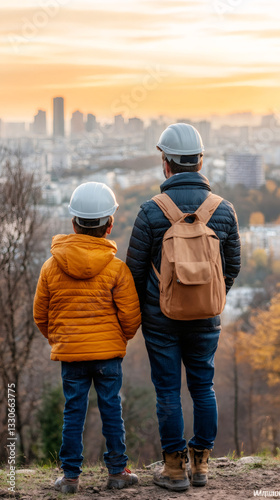 engineer, father, son, family, construction, hard hat, helmet, city, urban, landscape, sunset, architecture, building, development, future, planning, inspiration, vision, growth, progress, achievement, success, teamwork, partnership, education, career, real, estate, property, investment, skyline, view