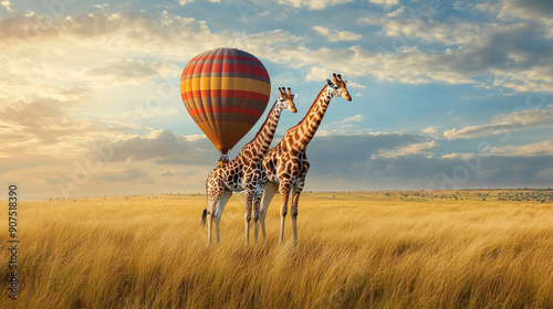 Two giraffes stand tall in a grassy field with an air balloon. Their necks reach high, looking over the land.