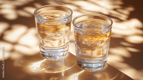 glasses, water, ice, cube, drink, beverage, refreshment, cool, cold, liquid, transparent, crystal, clear, clean, thirsty, quench, hydratation, sun, light, shadow, pattern, sunlight, ray, warm, gold, sunbeam, table, surface, still, life, photo, snapshot, photo, macro, close, up, closeup, minimalism, simple, everyday, object, glassware