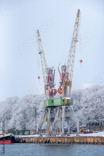 Two large industrial port cranes stand on a snowy dockside with frosted trees in the background, under a cold winter sky