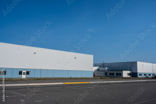 Two large white and blue warehouses.