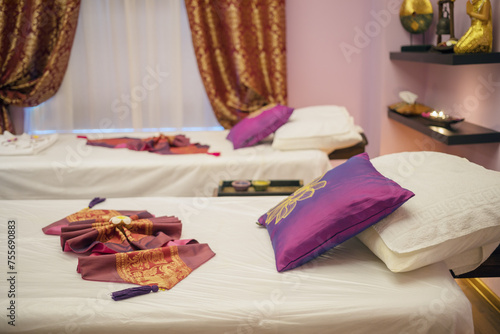 Two lounges for thai massage with towels, pillows and flowers in empty room