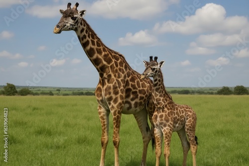 two majestic giraffes stand tall against a backdrop of endless green fields under a vast blue sky, embodying the beauty and grace of wildlife