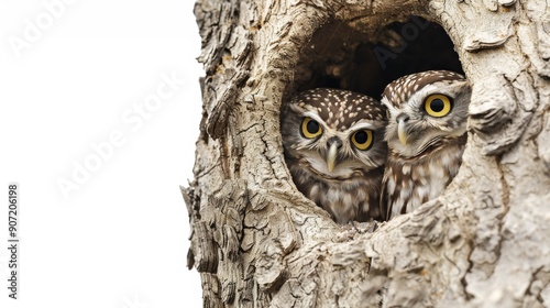 Two owls are sitting in a tree hole