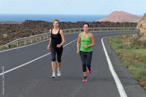 Two Runner women running on mountain road in beautiful nature