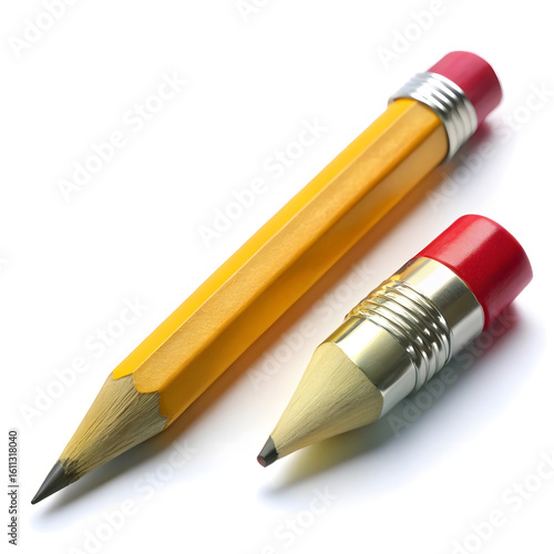 Two sharpened pencils, one long yellow and one short with a red eraser, isolated on a white background