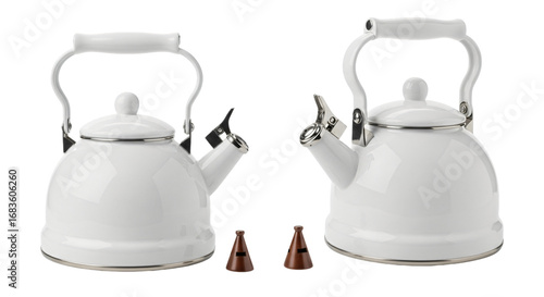 kettle, white, enamel, whistling, chrome, trim, handle, kitchen, appliance, cooking, water, heat, stove, tea, hot drink, hot, drink, beverage, metal, steel, spout, lid, top, round, curved, shiny, clean, modern, design, home, domestic, household, object, cookware, utensil, equipment, tool, nobody, indoor, still, life, 2, pair, set, cap, wooden, brown, small, whistle