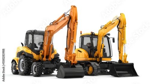 Two yellow excavators one with wheels and one with tracks stand on a white background