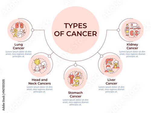 oncology, disease, cancer, lung cancer, stomach, tumour, symptom, swelling, liver, kidney, medicals, treatment, medicine, health care, health, vector, round, template, chart, presentation, illustration, icon, option, design, infographic, diagram, graph, process, step, concept, editable, circular, flowchart, workflow, customizable
