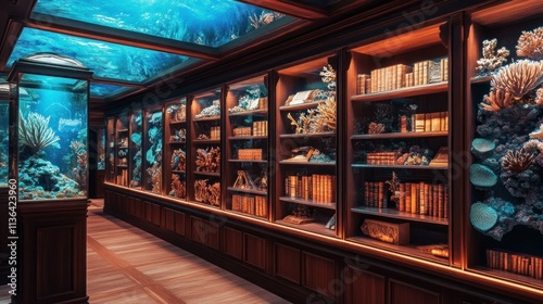 library, aquarium, book, coral, ocean, underwater, marin, life, shelf, water, fish, wood, interior, design, decor, vintage, antique, classic, reading, cognition, museum, art, glasses, illumination, lighting, dark, brown, blue, peaceful, serene, calm, elegant, luxury, rich, sophisticated, magical, unique, fascinating