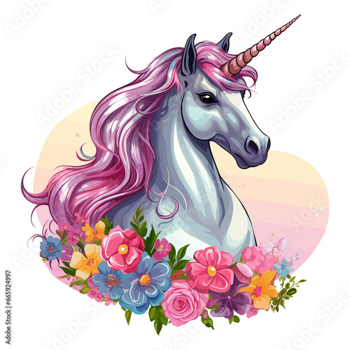 unicorn, flower, chaplet, fantasy, flower, floral, cute, character, animal, mammal, illustration, portrait, cartoon, head, watercolor, purple, pony, horse, clip art, horn, dream, children, birthday, romantic, bouquet, magic, logotype, invitation, blossom, nature, princess
