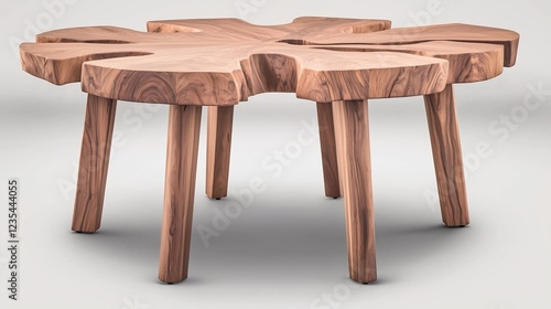 Unique wooden coffee table with a floral design, set against a minimalist background