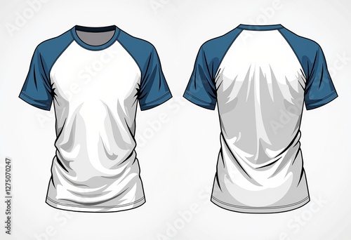 Unisex Raglan T-Shirt CAD Template: Fashion Flat Technical Drawing for Design & Manufacturing, Slim Fit, Short Sleeves, Stripes, Front and Back Views in White and Blue.