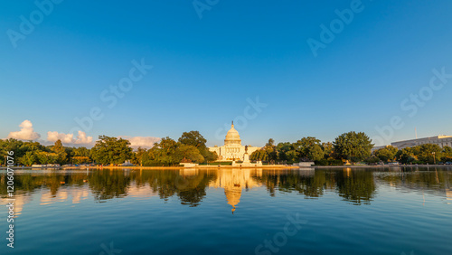United States Capitol Building reflected on the pool on a clear evening