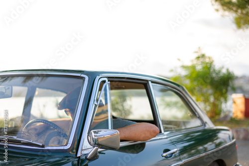 Unrecognizable man sitting at the driver seat of a classic car