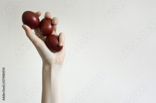 Unrecognizable women hand holding up three eggs. Knocking a red Easter egg. Old holiday tradition. Isolated on white background. Text empty space. Happy Easter!