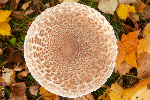 unusual texture of a mushroom umbrella on a background of autumn foliage, top view