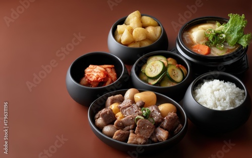 Upscale Korean Hotpot Restaurant Feast Featuring Beef Galbi Jjim, Rice, Kimchi, Side Dishes in Elegant Bowls on Warm Brown Background