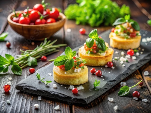 Urban exploration's culinary side: gourmet appetizers styled on dark slate, enhanced by herb & salt photography.