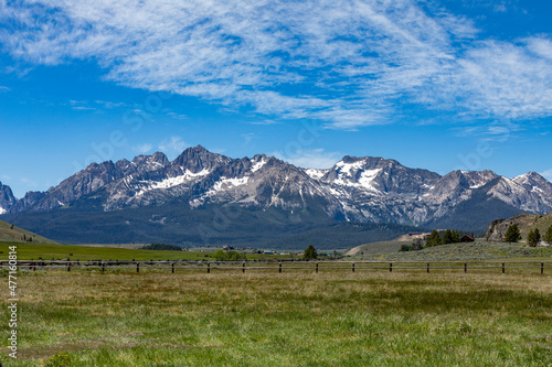 USA, Idaho, Stanley, Landscape with pastures and Sawtooth Mountains