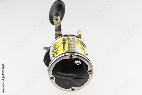 white, aluminium, background, big, colours, equipment, fishing, fishing gear, green, handle, hobby, horizontal, isolated, leisure, line, macro, metal, nobody, object, reel, single, sport, tackle