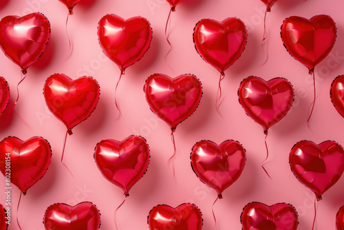 Valentine's Day Red Heart Balloons on Pink Background Flat Lay Copy Space Concept