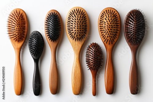 Variety of hairbrushes displayed on a neutral background showcasing different materials and sizes for hair care needs