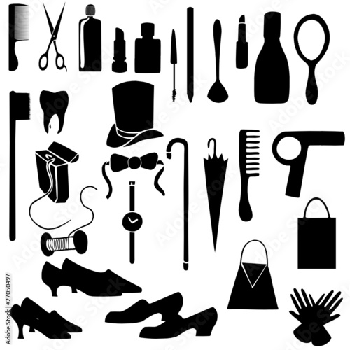 vector, black, comb, scissors, hat, shoe, cane, bow, make-up, brush, floss, teeth, umbrella, hair drier, mirror
