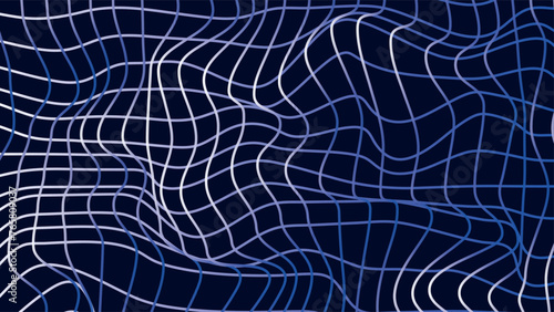Vector abstract background with variously twisted grid. Dark blue background. Grid of light gradient color. Abstract wallpaper, backdrop, web.