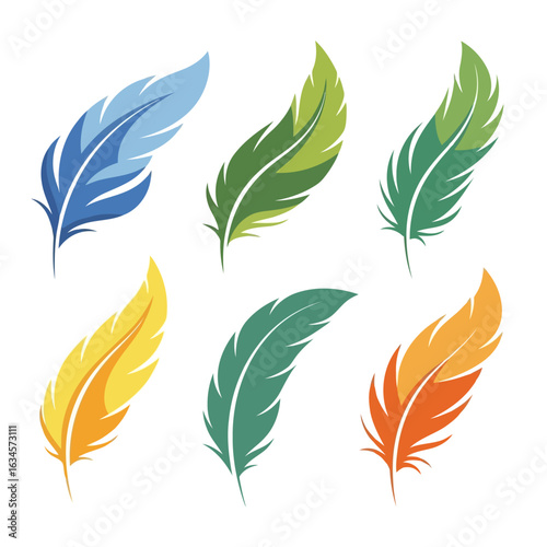 Vector art of collection of colorful bird feathers in blue, green, yellow, and orange, isolated on white background