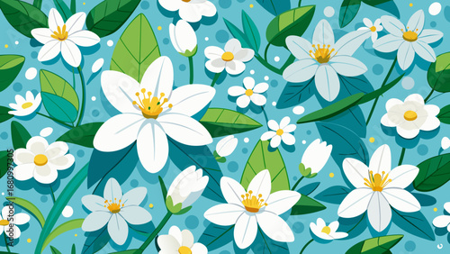 Vector art of seamless floral pattern with white flowers and green leaves, a vibrant background for spring and summer designs, perfect for textile, wallpaper, and wrapping paper