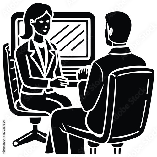 business, people, meeting, woman, man, sitting, desk, computer, screen, discussing, work, professional, office, environment, collaboration, teamwork, corporate, discussion, conversation, communication, strategy, planning, analysis, presentation, interview, hr, recruitment, job, career, success, agreements, partnership, client, adviser, employee, manager, executive, leader, team, group, together, indoor, interior, modern, style, graphic