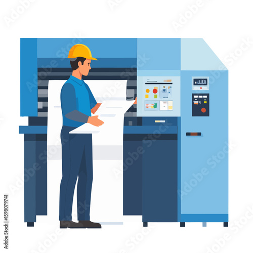 printing, machine, printer, equipment, industry, technology, production, manufacturing, men at work, operator, engineer, technician, hard hat, safety, uniform, blue, orange, white, paper, sheet, control panel, buttons, display, digital, vector, illustration, graphic, design, flat, style, modern, process, automation, print, press, factory, workplace, job, professional, skill, operation, assembly, industrial, business, communication, information, output, creation, workflow
