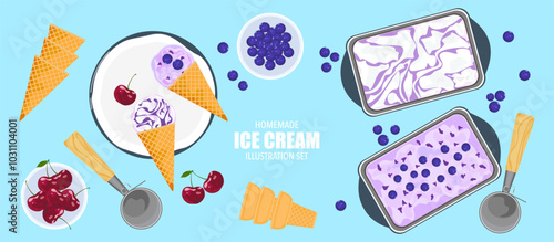 Vector illustration set of gelato ice cream on tray, fruit, blueberry, cherry, vanilla. Ice cream scoop, crispy waffle cone. Bakery. Dessert menu, isolated ice cream illustration. from the background