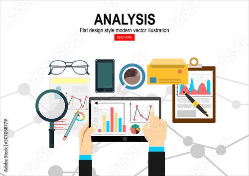 Vector modern flat design and business analysis and planning, consulting, team work, project management, brainstorming, research and development. Concepts web banner and printed materials.