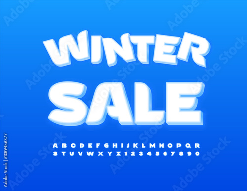 Vector promo banner Winter Sale. Snowy White Font. Modern set of Alphabet Letters and Numbers