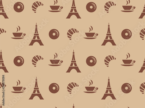 Vector seamless pattern for cafes, or for packing products. Pastries, coffee, Paris.