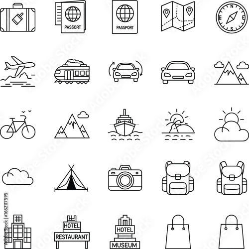 Vector travel icons set, suitcase, passport, map, compass, airplane, train, car, mountain, bicycle, ship, sunset, cloud, tent, camera.