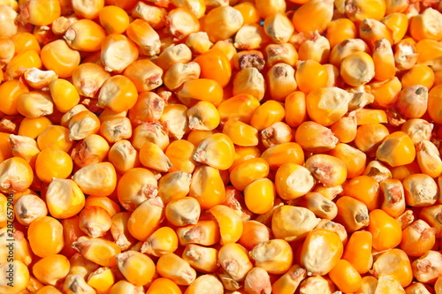 Vegetable background of a bright, yellow, ripe grain corn closeup. Texture of extracted and sun-dried seeds. Rich harvest of fodder crops for cattle. Vegetarian, vegan, lean food. Place for text.