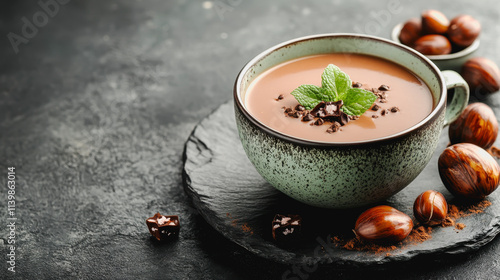 velvet, chestnut, soup, chocolate, hazelnut, food, menu, culinary, photo, epicure, dish, slate, background, composition, lighting, perspective, texture, colours, presentation, appetising, delicious, rich, smooth, elegant, artistic, style, warm, inviting, eatery, dining, chef, cookery, garnish, bowl, table, decor, healthy, organic, seasonal, ingredient, savour, taste, indulgent, luxury, visual, capture, macro, sharpened