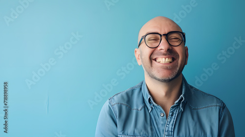 Very happy laughing man with glasses in front of blue background with copy space