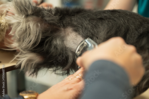 dog, vet, grooming, shaving, electric, razor, pet, animal, care, health, hygiene, clinic, veterinary, practice, fur, hair, trim, cut, clipper, professional, service, medicals, treatment, procedure, small, breed, miniature, schnauzer, domestic, canino, mammal, salon, indoor, tabletop, close, up, hand, holding, work, job, occupation, skill, expertise, precision, detail, comfort, safety, clean, wellness